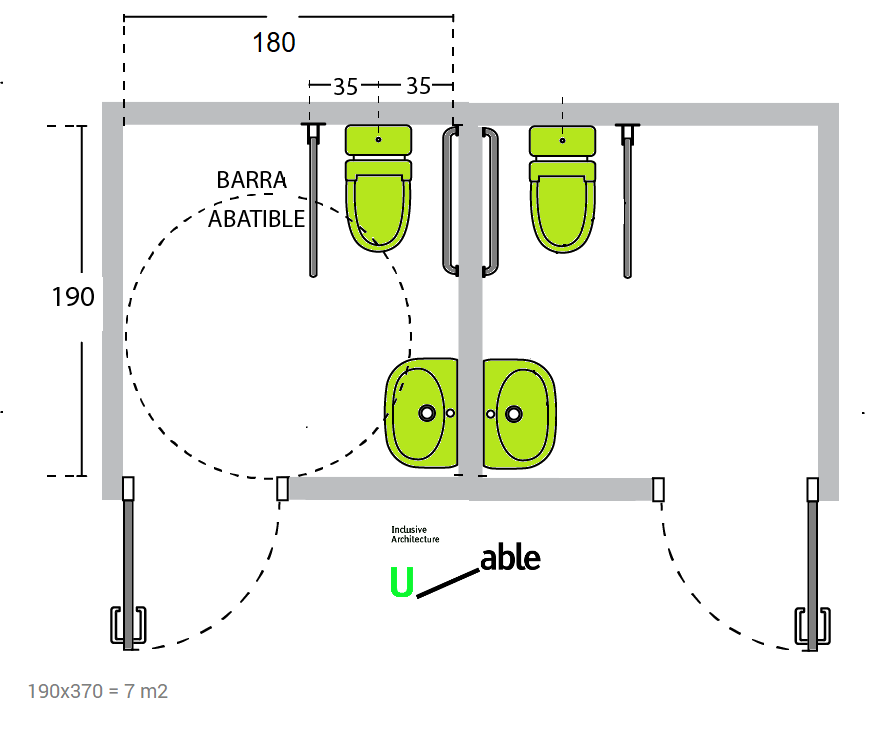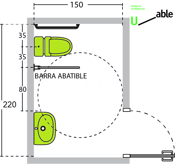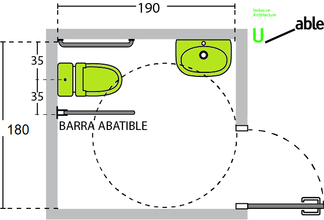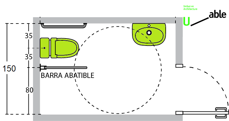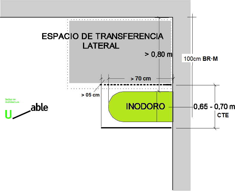 - Hay un espacio de transferencia lateral de anchura ≥ 80 cm y ≥ 75 cm de fondo hasta el borde frontal del inodoro. En uso público, espacio de transferencia se exige a ambos lados.