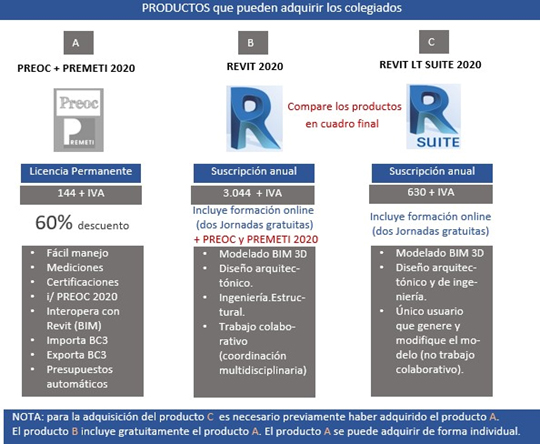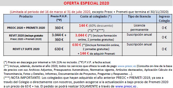 (la oferta para los productos Autodesk termina el 31 de Julio) (precios de la tabla con descuentos ya aplicados)Después de haber realizado un estudio sobre las opciones que actualmente ofrece Autodesk se recomienda la adquisición de los siguientes paquetes:PAQUETE 1) Para un estudio de un único usuario, o varios usuarios que no trabajen de forma colaborativa, sería suficiente disponer de los productos A + C. Dispondría de dibujo en 3D y el modelado BIM con Revit Suite 2020 a un precio reducido anual. Con Premeti, además de tener el programa PREMETI 2020 de mediciones y presupuestos, dispondrá de la base de precios y datos PREOC 2020. Podrá realizar las mediciones y presupuestos importándolas de Revit Suite 2020.PAQUETE 2) Para un estudio de varios usuarios con trabajo colaborativo que requiera de una coordinación multidisciplinar, sería necesario disponer de los productos A + B. Dispondría de dibujo en 3D y el modelado BIM con Revit 2020 a un precio más elevado anual pero necesario para un trabajo multidisciplinar. Con Premeti, además de tener el programa PREMETI 2020 de mediciones y presupuestos, dispondrá de la base de precios y datos PREOC 2020. Podrá realizar las mediciones y presupuestos importándolas de Revit 2020.Los productos de Autodesk se comercializan sin margen comercial alguno por parte de Atayo, y se distribuyen a través de un distribuidor Platino (máxima calificación Autodesk) con las ventajas que ello supone en precio y servicio.La oferta que se hace este año es sobre el conjunto de PREOC 2020 + PREMETI 2020, así como para 2 productos de Autodesk. Para adquirir un producto de Autodesk es necesario que previamente haya adquirido la oferta conjunta PREOC 2020 + PREMETI 2020.Productos para adquirir: Se podrán adquirir la siguiente combinación de productos:1) (PREOC + PREMETI 2020) -144 € + 21% IVA2) REVIT 2020 que incluye gratuitamente (PREOC + PREMETI 2020) - 3.044 € + 21% IVA3) (PREOC + PREMETI 2020) + REVIT LT SUITE 2020 - 774 € + 21% IVA- Todos los productos solamente se distribuyen por descarga web.- El precio que aparece en la tabla es ya aplicado el descuento del 60% en Preoc+Premeti.